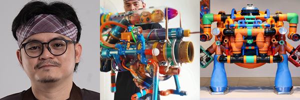 Even as a child, Lino Jamisola has created his own toys. Simple materials like newspapers, cartons, styrofoam, tin cans and other odds and ends were transformed into space ships of different shapes and designs. Growing up, he familiarized himself with different equipments and power tools and learned their safe and proper use. His skills were further honed thru the vocational courses he enrolled in during his high school years and even more so when he decided to take up Fine Arts at the Technological University of the Philippines in Manila. All of these shaped his approach in his art practice: a mix of playful intuition and precision execution.